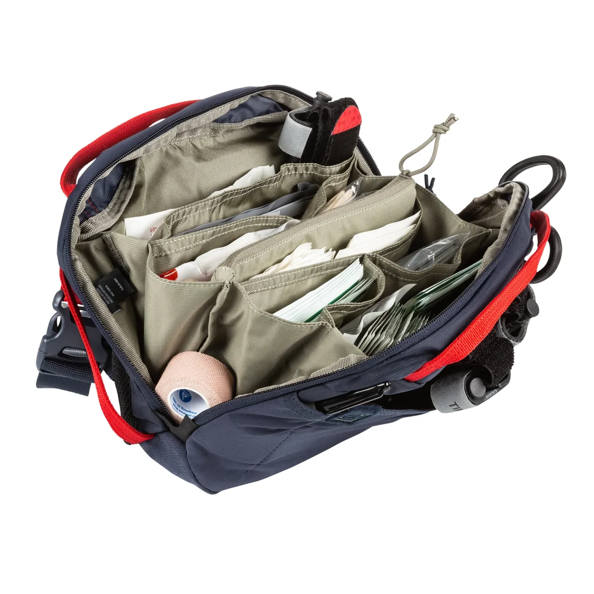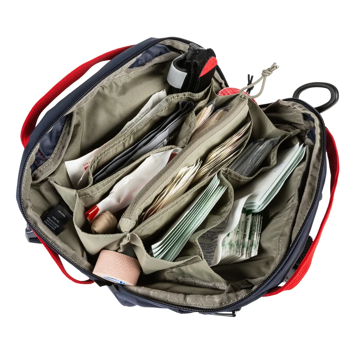 Divisori, tasche compresa una tasca centrale elasticizzata con cerniera e bande elastiche rendono facile trovare ed accedere a qualsiasi presidio necessario per gestire il problema.
