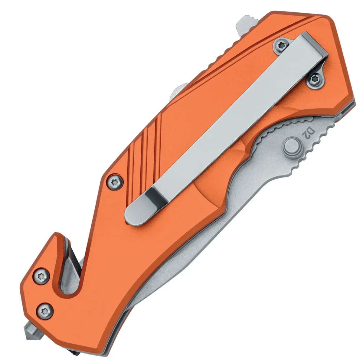 Nell’impugnatura troviamo invece, oltre all’immancabile frangivetro, un tagliacinture da utilizzare in caso di necessità, un fischietto rimovibile per segnalazione e un acciarino da utilizzare in situazioni d’emergenza.