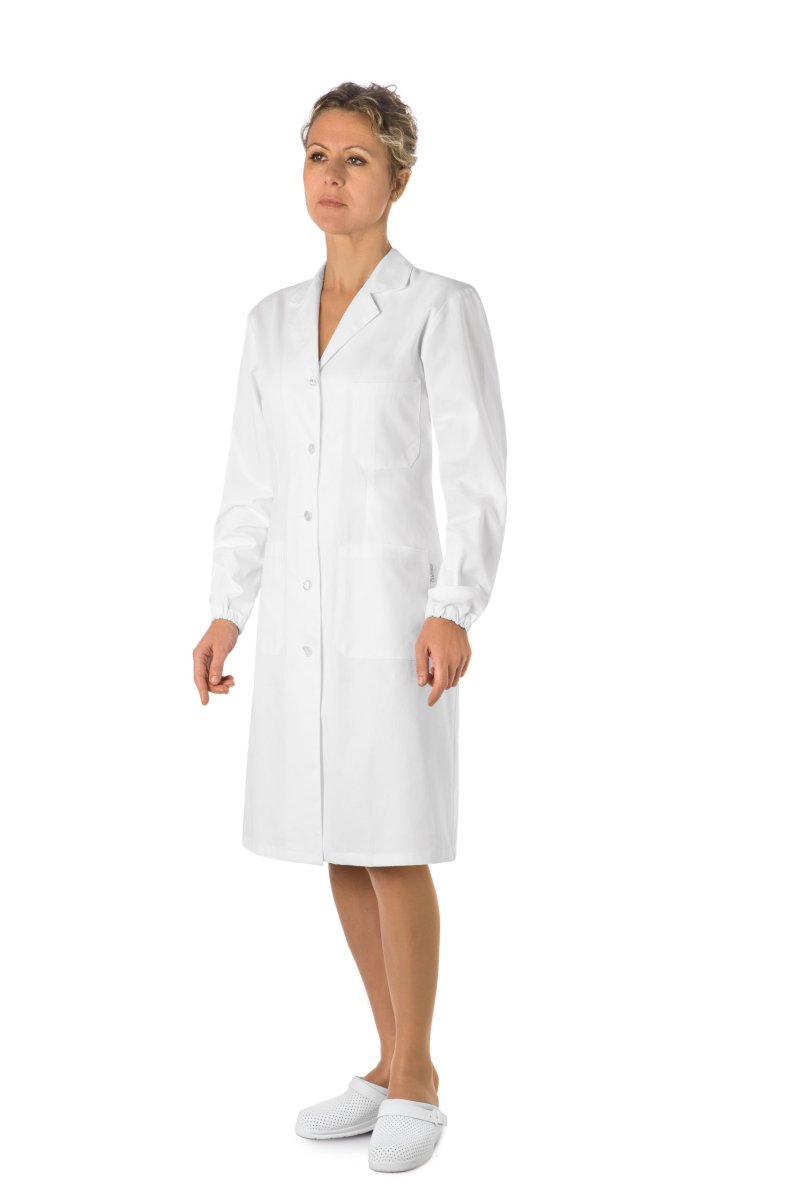 Camice medico donna tessuto 100% cotone, 3 tasche, polsino con polso, bottoni a vista. Colore bianco.