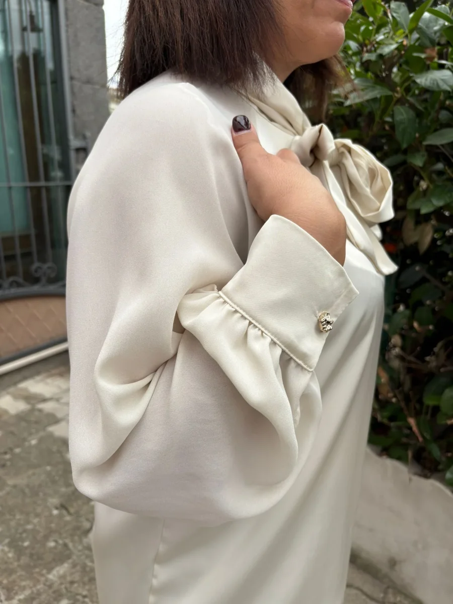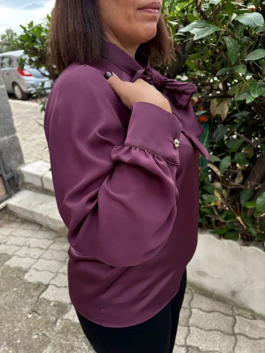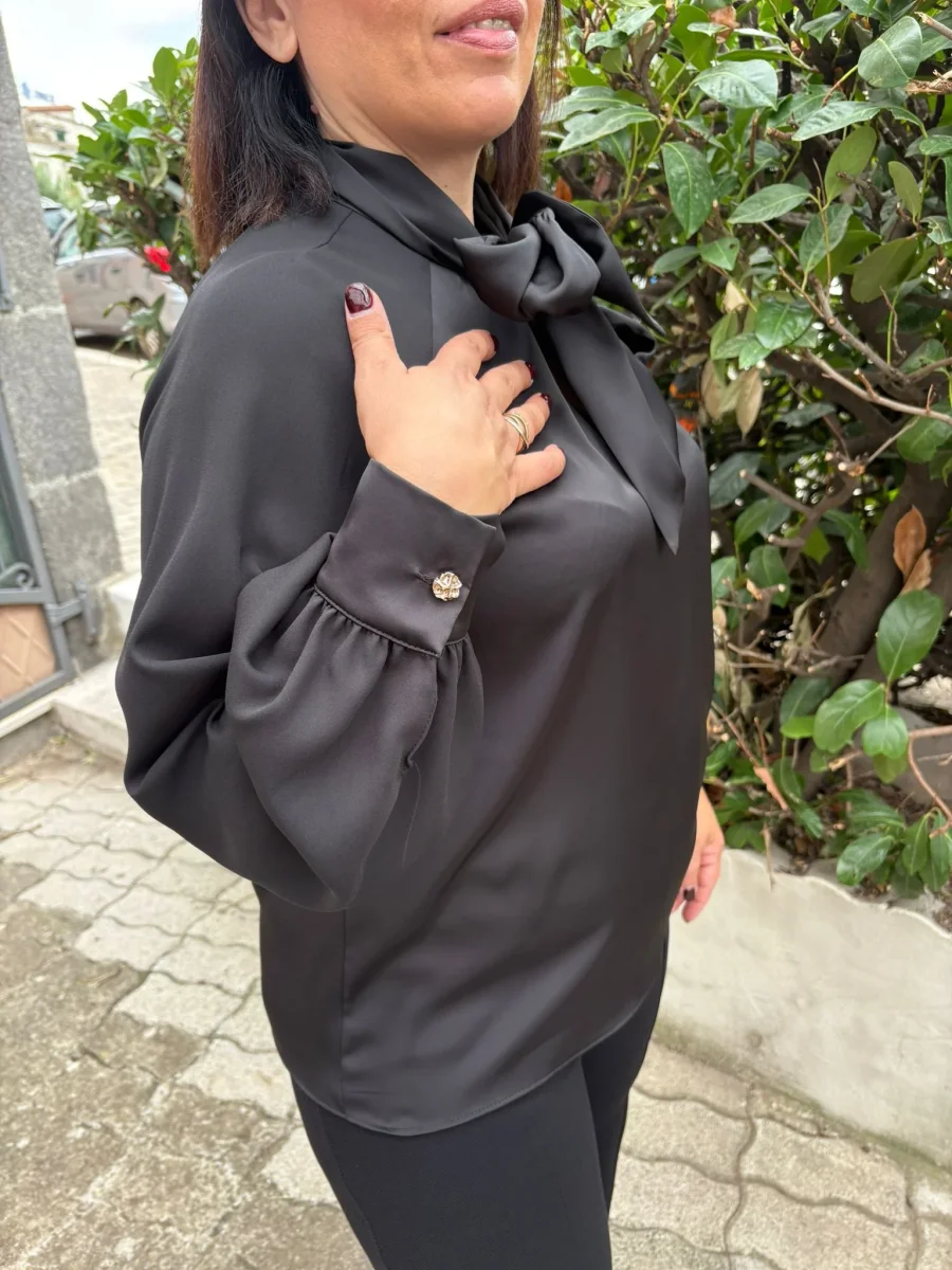 Camicia elegante con fiocco e bottoni gioielloRaffinata e femminile, questa camicia elegante si distingue per il dettaglio del fiocco sul collo e i bottoni gioiello che illuminano il capo. Realizzata in tessuto leggero e scivolato, è perfetta per completare outfit da cerimonia, eventi o look da ufficio chic e ricercati.