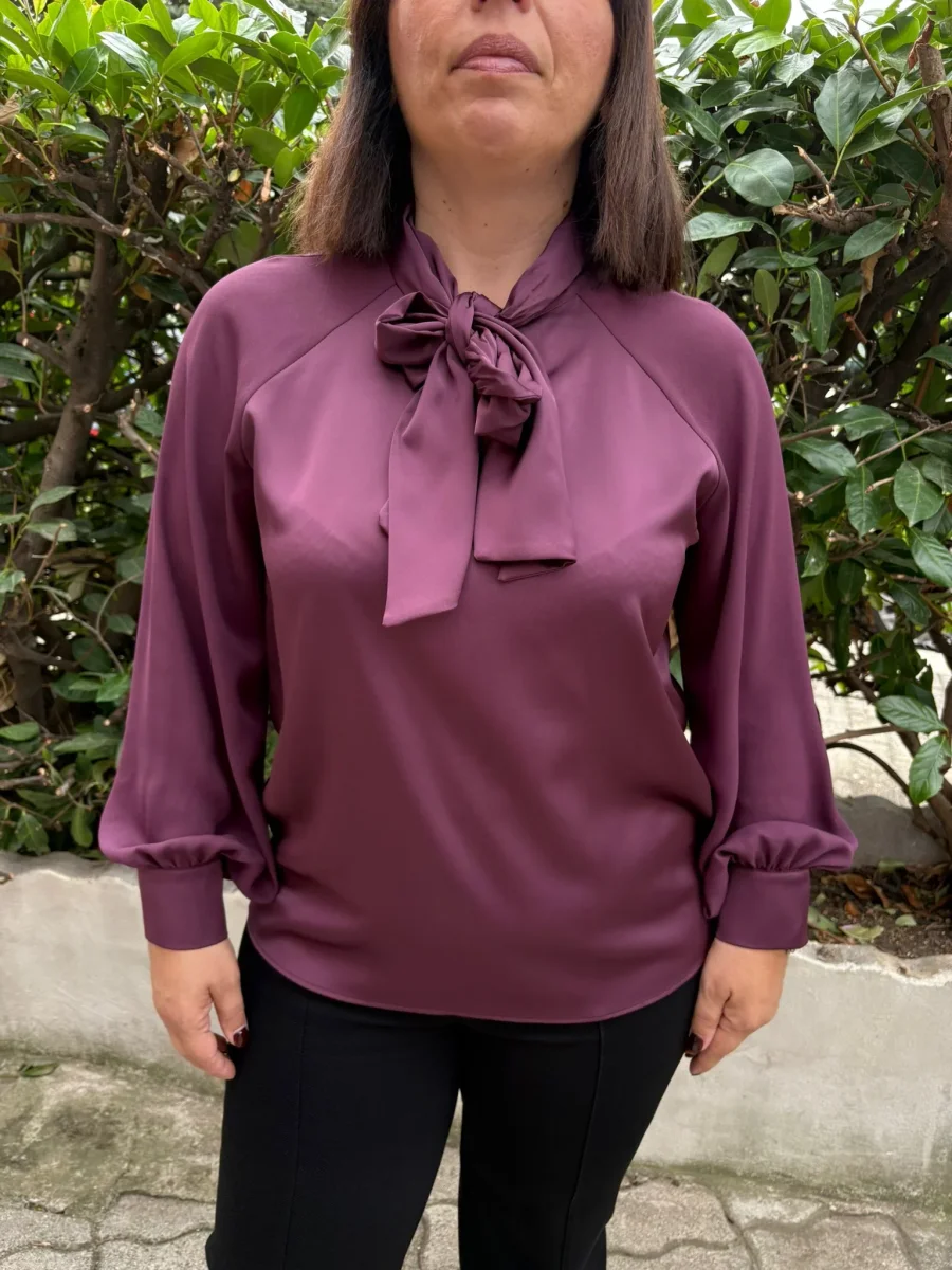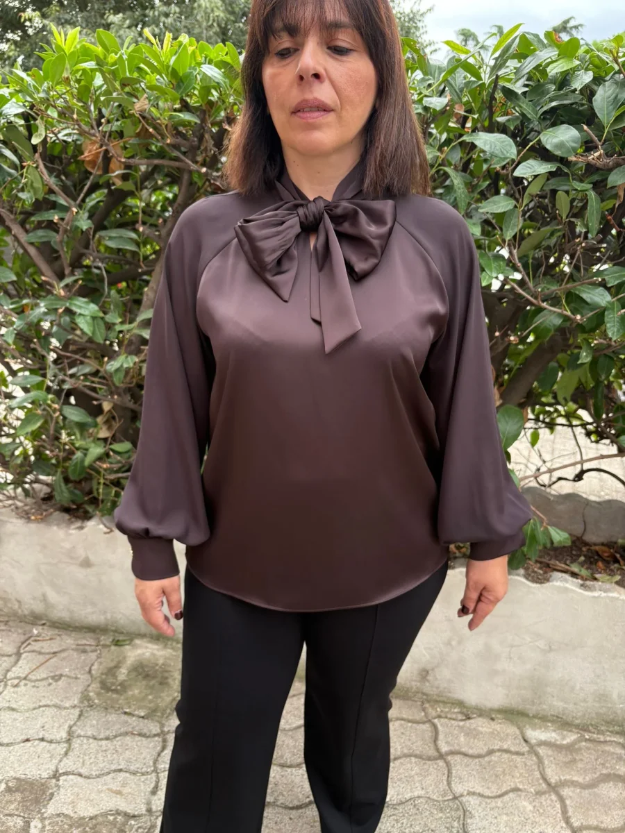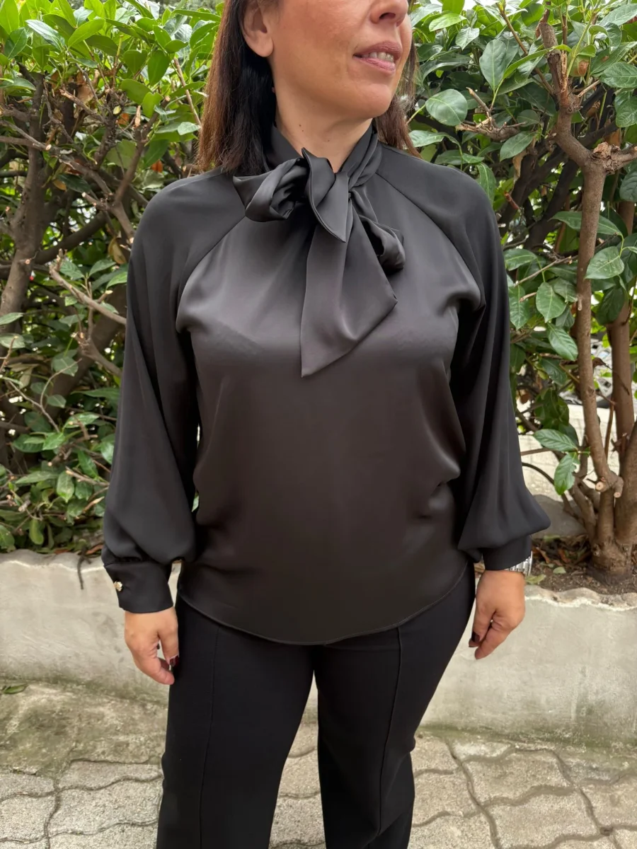Camicia elegante con fiocco e bottoni gioielloRaffinata e femminile, questa camicia elegante si distingue per il dettaglio del fiocco sul collo e i bottoni gioiello che illuminano il capo. Realizzata in tessuto leggero e scivolato, è perfetta per completare outfit da cerimonia, eventi o look da ufficio chic e ricercati.