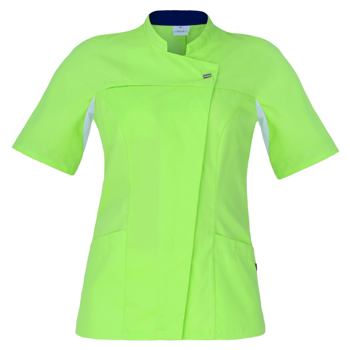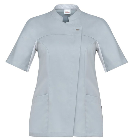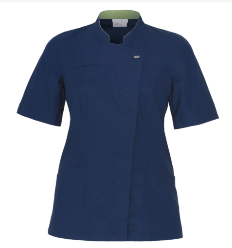 Casacca medicale DONNA tessuto TENCELL (50% poliestere 50% lyocell), manica corta, collo coreana, 2 tasche+ taschino sul petto, abbottonatura nascosta con automatici, maniche con polsini in maglia.