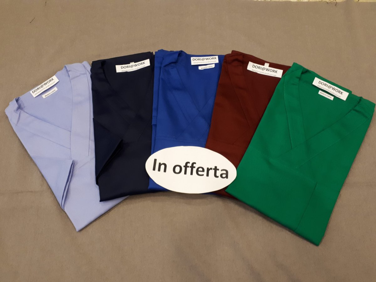 Casacca unisex mezza manica, collo a V, con due tasche davanti e un taschino porta penna, tessuto misto cotone, colori: Azzurro, Verde medicale, Bordeaux, Bluette, Blu.