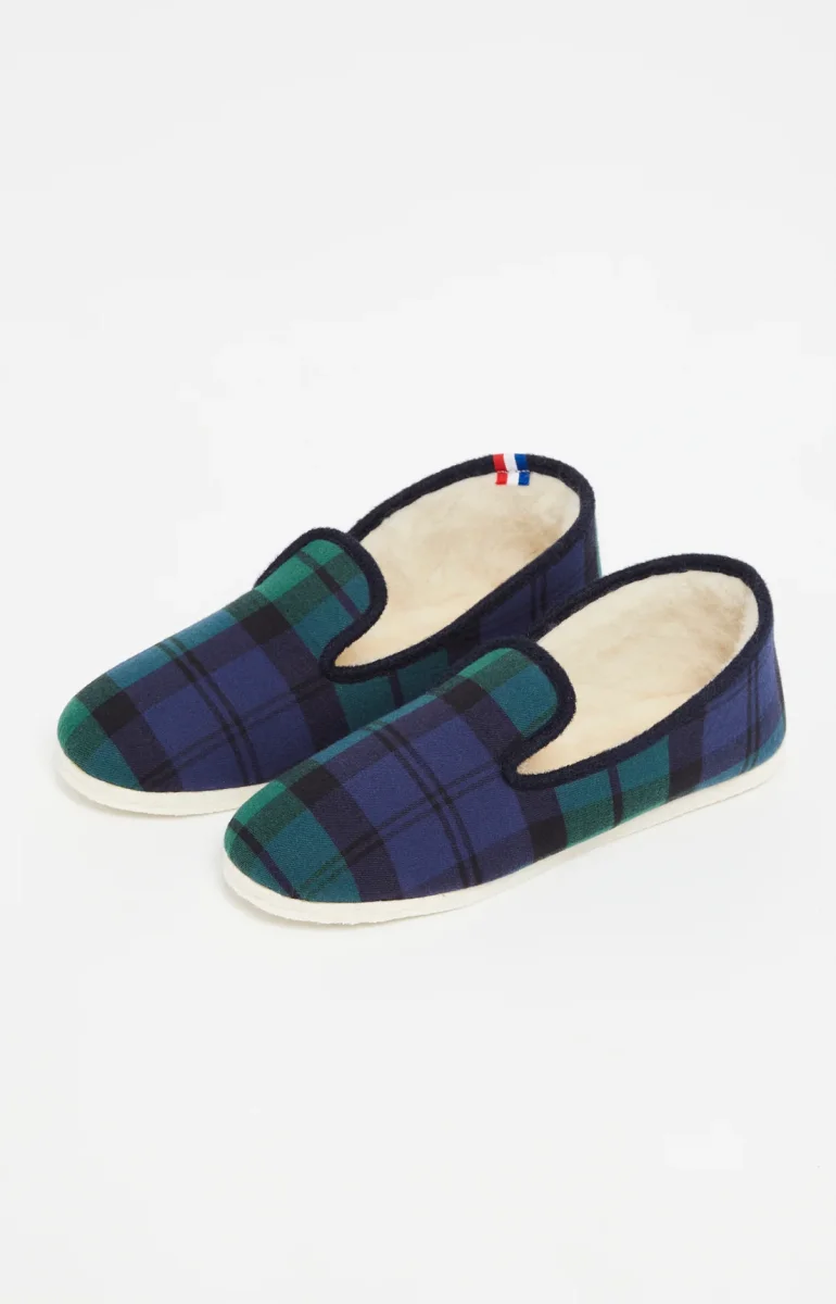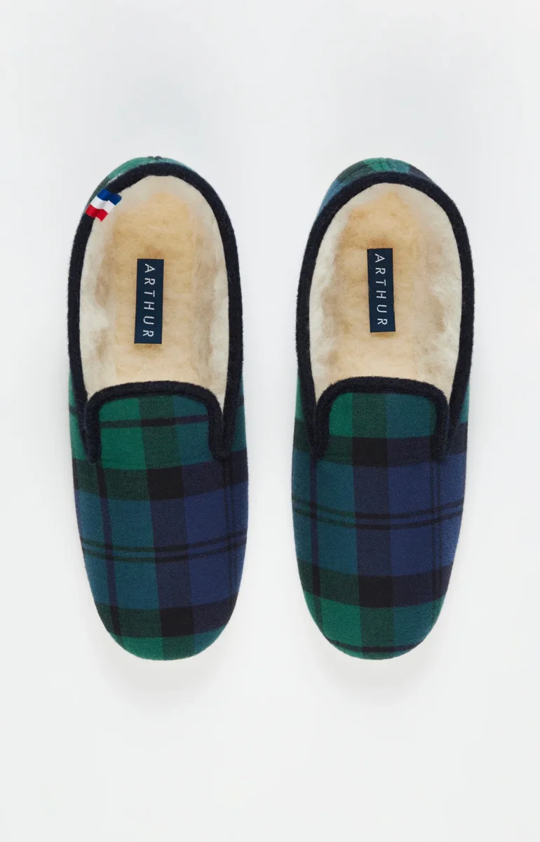 – Chaussons homme– Charentaises traditionnelles avec doublure intérieure en laine vierge– Carreaux écossais en coton– Galon contrasté– Semelle en feutre – Fabriquées en France dans la plus pure tradition charentaise