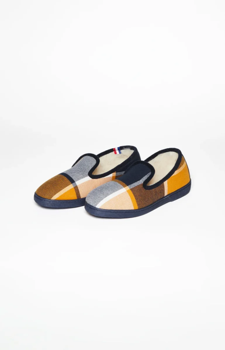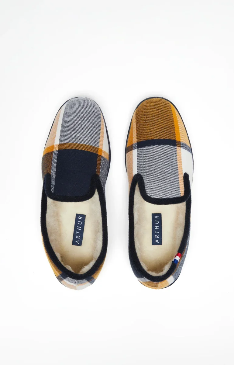 Le style ARTHUR pour garder vos pieds au chaud à la maison. – Chaussons homme – Doublure intérieure en laine – Semelle injectée anti-dérapante – Motif exclusif dessiné à Paris – Fabriquées en France