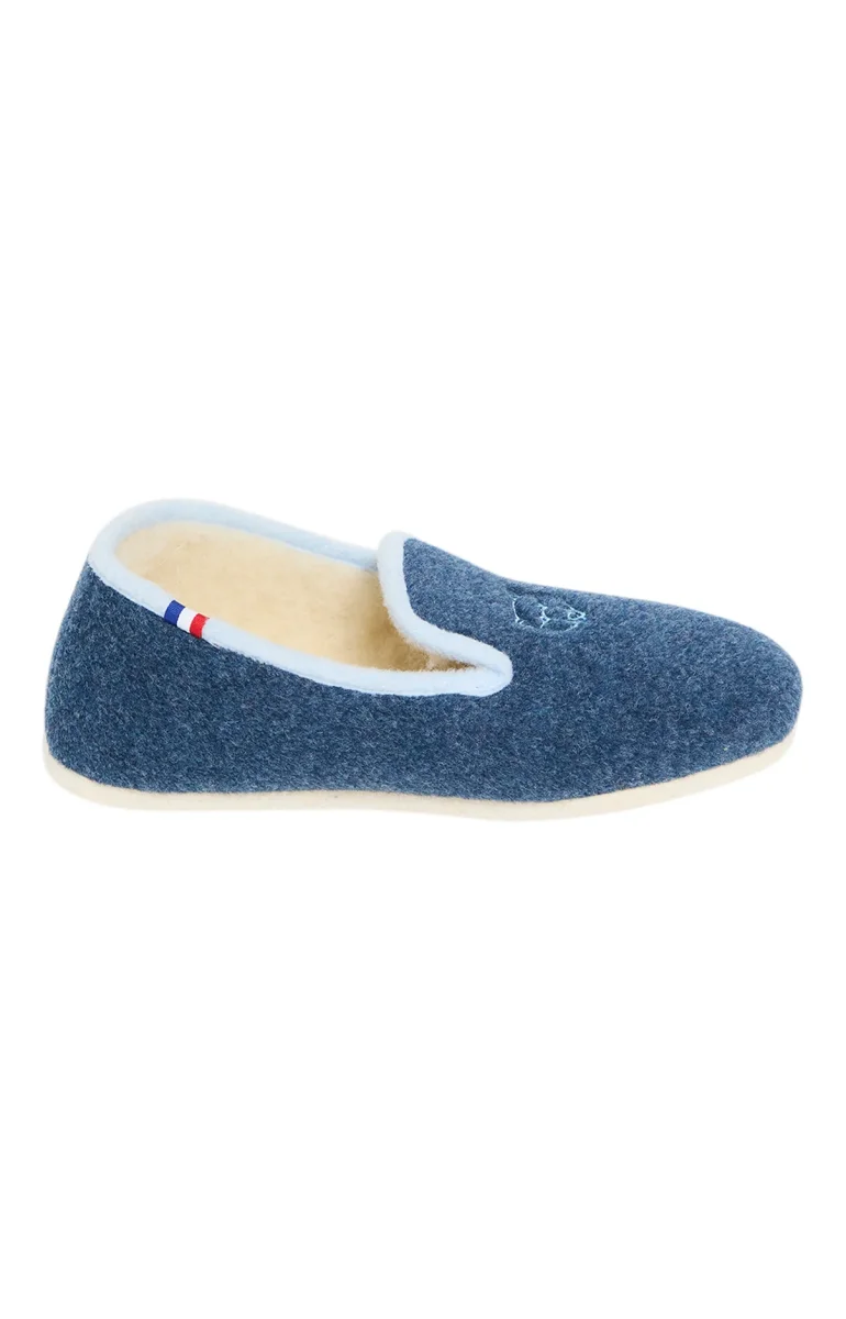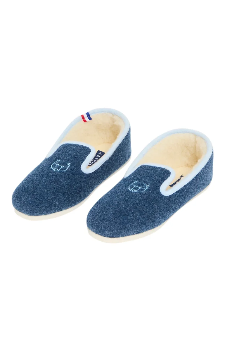 Le style ARTHUR pour garder vos pieds au chaud à la maison – Charentaises homme – Dessus en laine vierge – Galon contrasté – Broderie ours – Doublure intérieure en laine vierge – Semelle en feutre antidérapante – Motif exclusif créé à Paris – Fabriquées en France