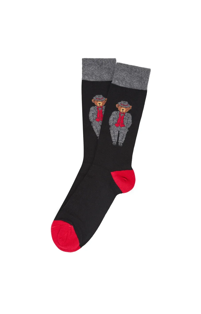 Faites sortir le dandy qui sommeille en vous grâce à ces chaussettes homme. Elles font la part belle au classique de leur fond noir et à l’originalité osée du Teddy Bear en complet veston, sorti tout droit des années 30. Promis, le confort sera, lui aussi, à la table de jeu.