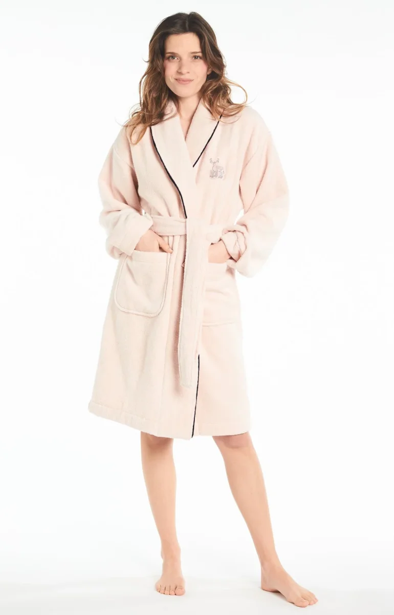 Irrésistible avec sa couleur poudre et son motif animalier, ce peignoir femme 100% coton ne vous quittera plus à l’intérieur de chez vous, tant il est doux et agréable contre votre peau.