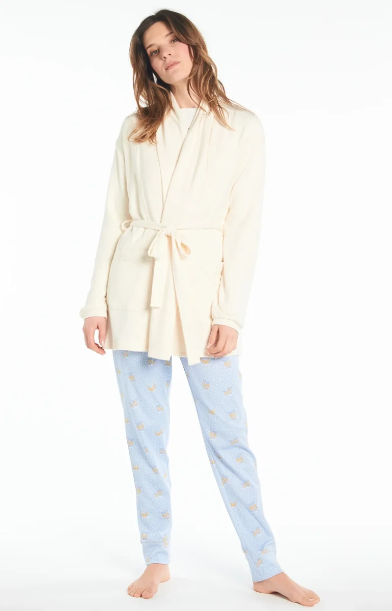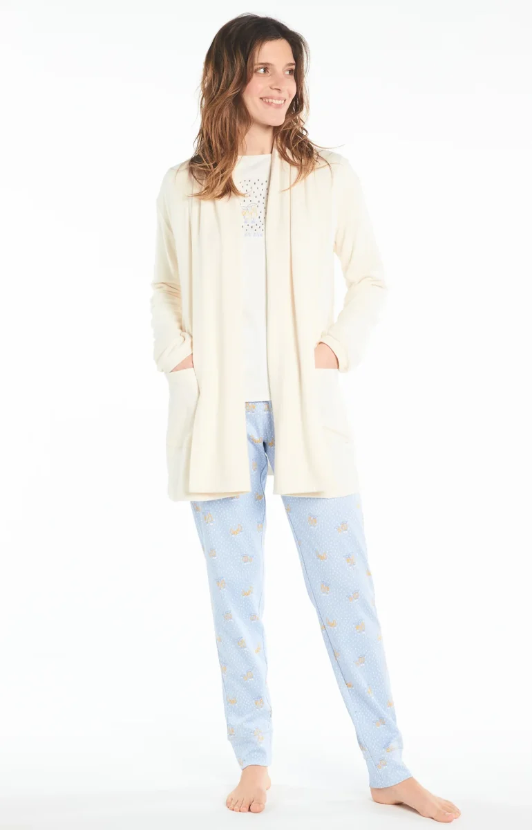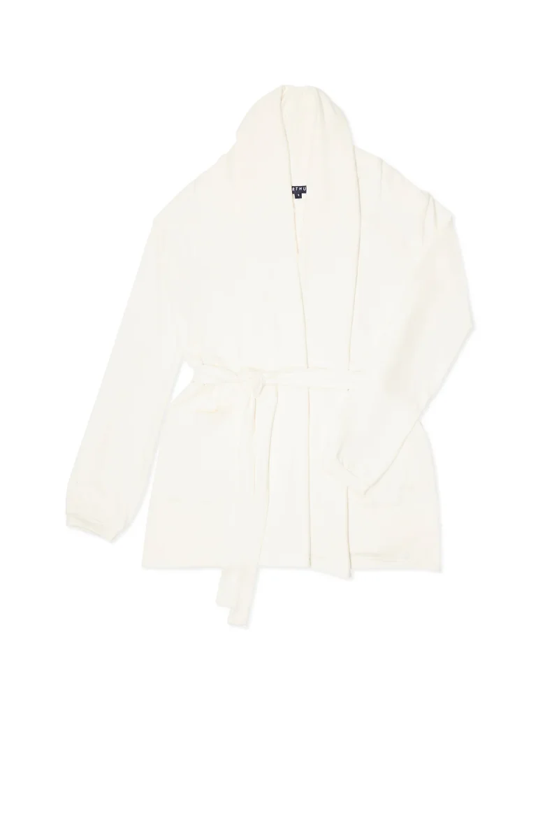 Ce peignoir à la coupe courte, dominé par sa couleur unie ivoire passe-partout, peut se porter à tout instant de la journée à la maison, si vous avez besoin de la chaleur de sa composition toute douce, ou simplement d’une tenue pour vous détendre.