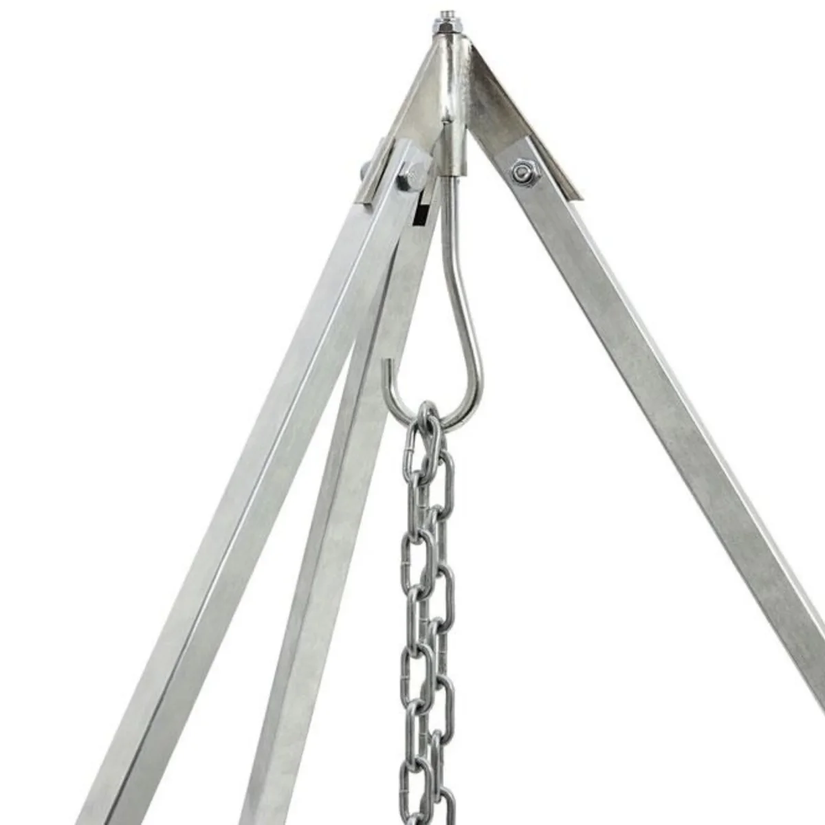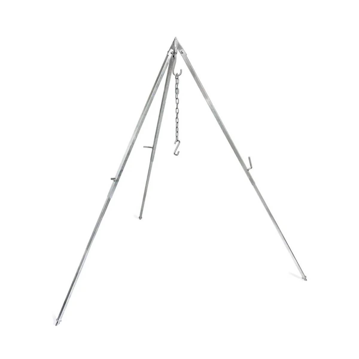 Grazie alla sua catena variabile, la distanza tra il forno olandese o il bollitore e il fuoco può essere facilmente modificata in qualsiasi momento. I piedini smussati assicurano che il treppiede rimanga robusto e sicuro su tutti i tipi di superficie.