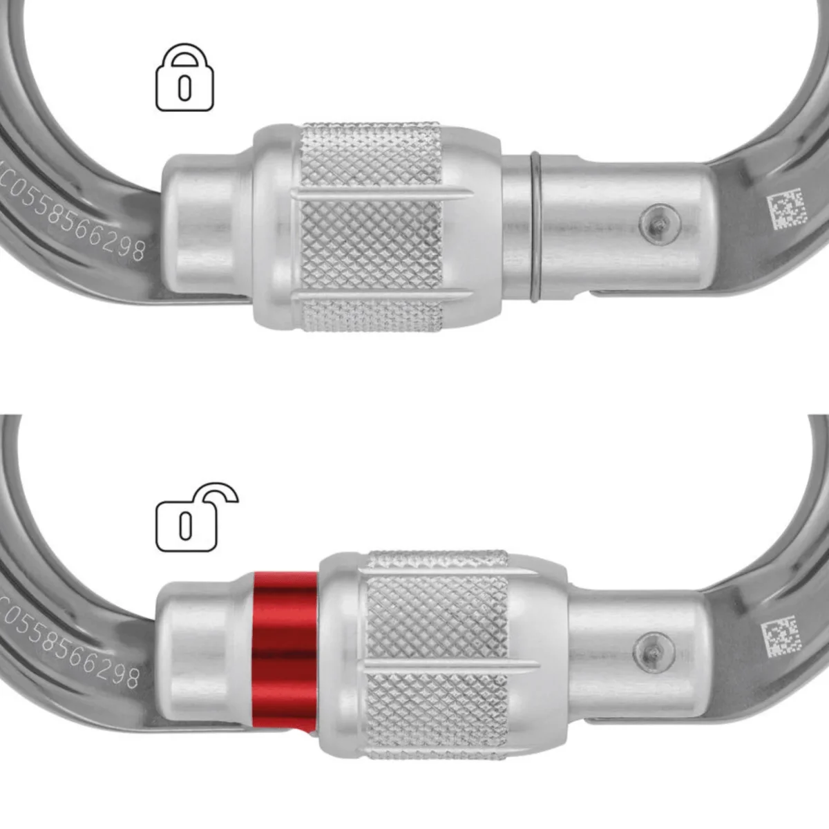 - SCREW-LOCK: sistema manuale a vite con indicatore visivo rosso quando il moschettone non รจ bloccato.
