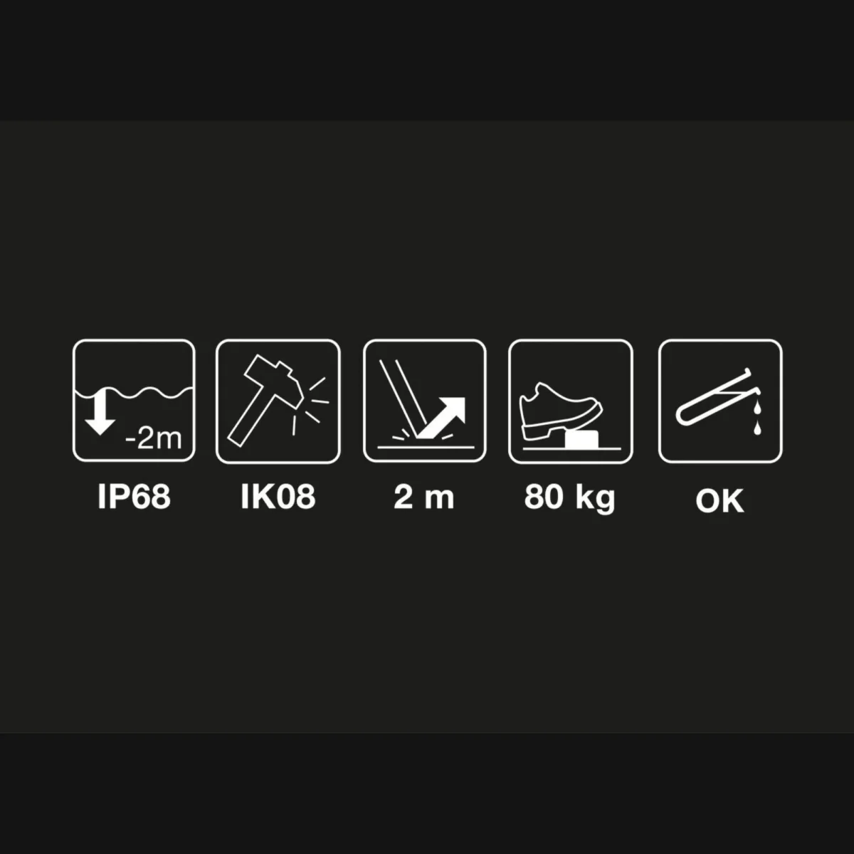 - robusta, la lampada resiste agli urti (IK08), alle cadute (fino a 2 metri), e allo schiacciamento (fino a 80 kg)