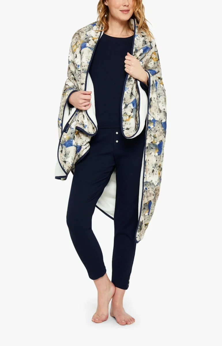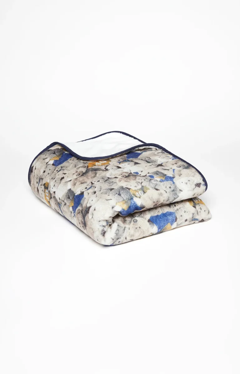 – Plaid en micro polaire imprimé et doublé en fourrure polaire unie