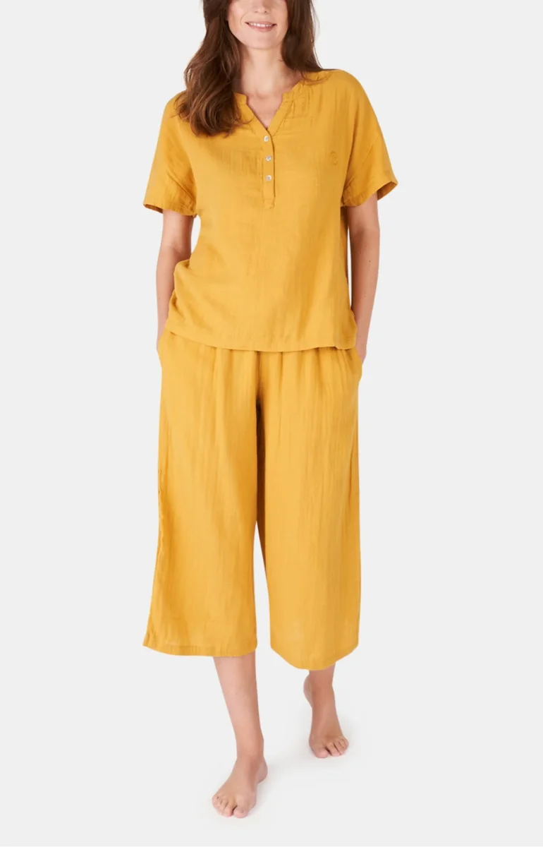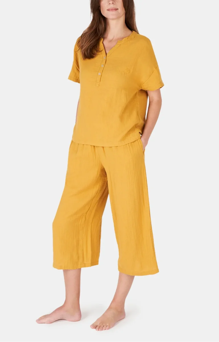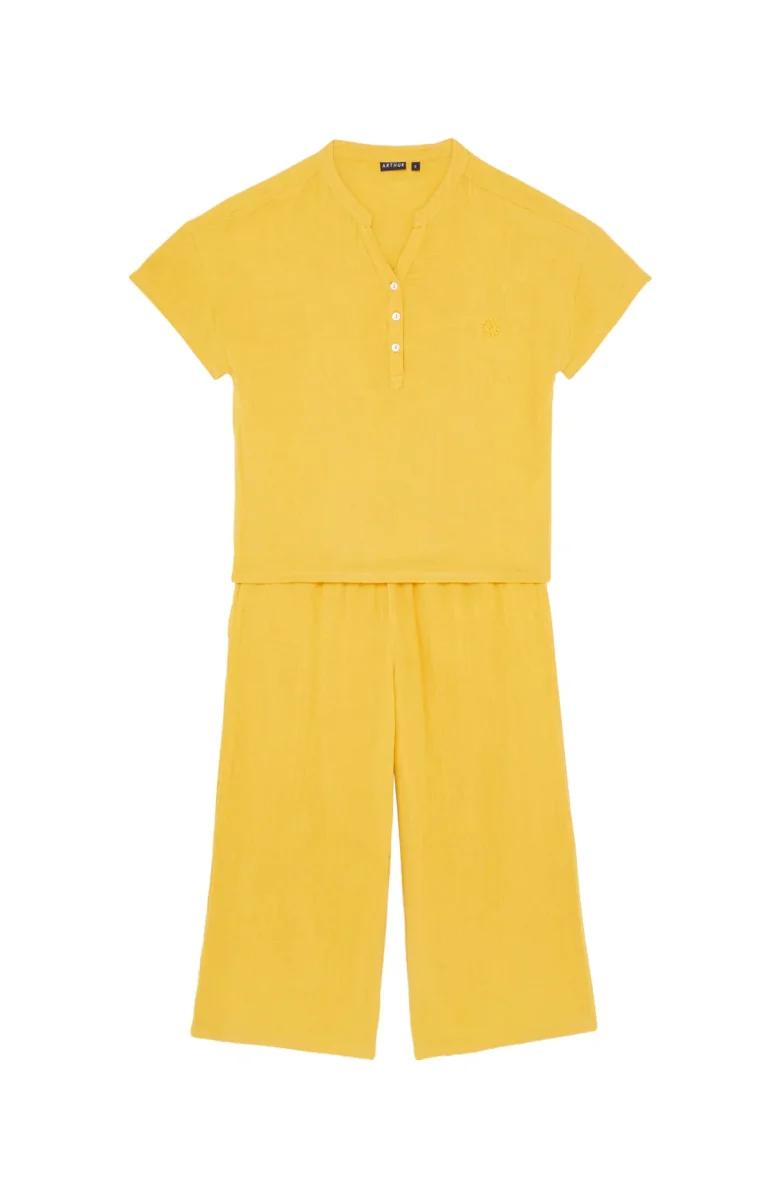 – Ensemble de pyjama femme ou tenue d’été – à porter de jour comme de nuit, à la plage comme à la maison – 100% gaze de coton issu de l’agriculture biologique – Tee-shirt manches courtes, col tunisien 3 boutons nacre véritable – Pantalon mi-long évasé, ceinture élastiquée et cordon de serrage – Motif exclusif […]