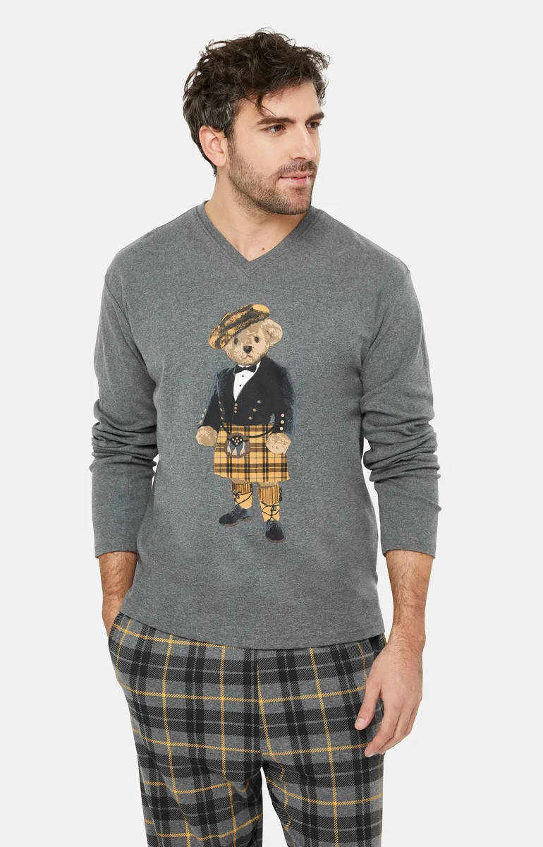 – Pyjama homme long en coton avec cordon de serrage – Tee-shirt uni col V à manches longues– Motif créé à Paris – Confectionné dans nos ateliers partenaires en Inde