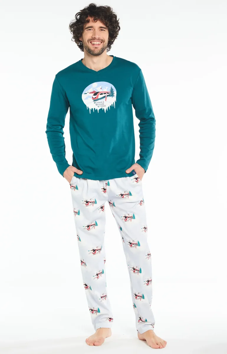 Avec sa coupe longue et son motif hivernal à souhait, ce pyjama long homme vous permettra de sortir du train-train habituel du homewear nocturne, pour foncer à grande vitesse vers la gare de l’Originalité Rêvée. En coton interlock en couleurs contrastantes et neigeuses, ce modèle chaud et tendance vous mettra plus vite que vous ne le pensez sur les rails de nuits parfaites, toujours en première classe du style !