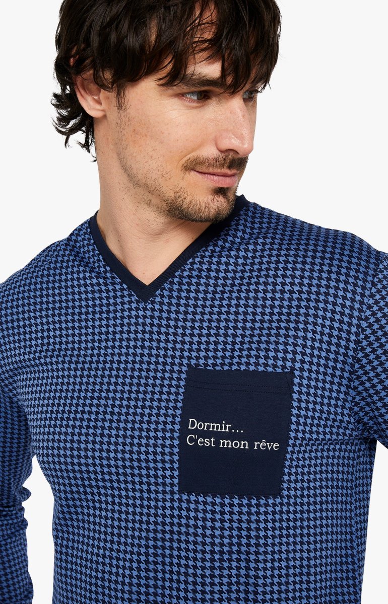 – Ensemble de pyjama Homme – 100% coton issu de l’agriculture biologique – Tee-shirt manches longues, col V – Poche poitrine impression “dormir, c’est mon rêve” – Pantalon de pyjama avec ceinture élastiquée, cordon de serrage et 2 poches côtés – Motif exclusif créé à Paris – Confectionné dans nos ateliers partenaires en Inde