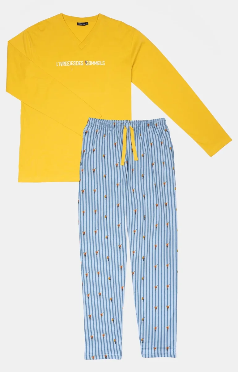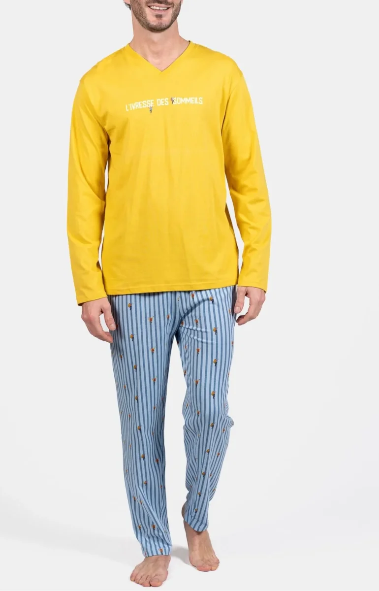 – Ensemble de Pyjama Homme – 100% coton – Tee-shirt uni col V, manches longues – Sérigraphie poitrine – Pantalon de pyjama avec ceinture élastiquée, cordon de serrage et 2 poches côtés – Motif exclusif créé à Paris – Confectionné dans nos ateliers partenaires en Inde