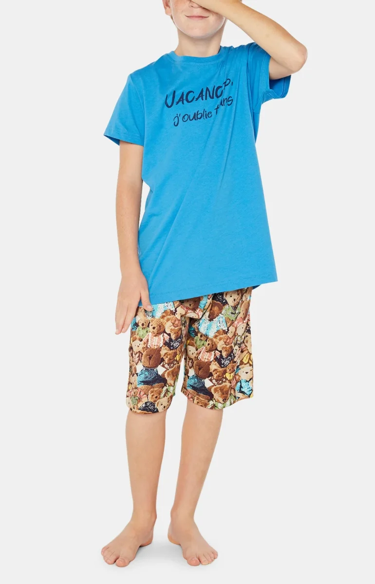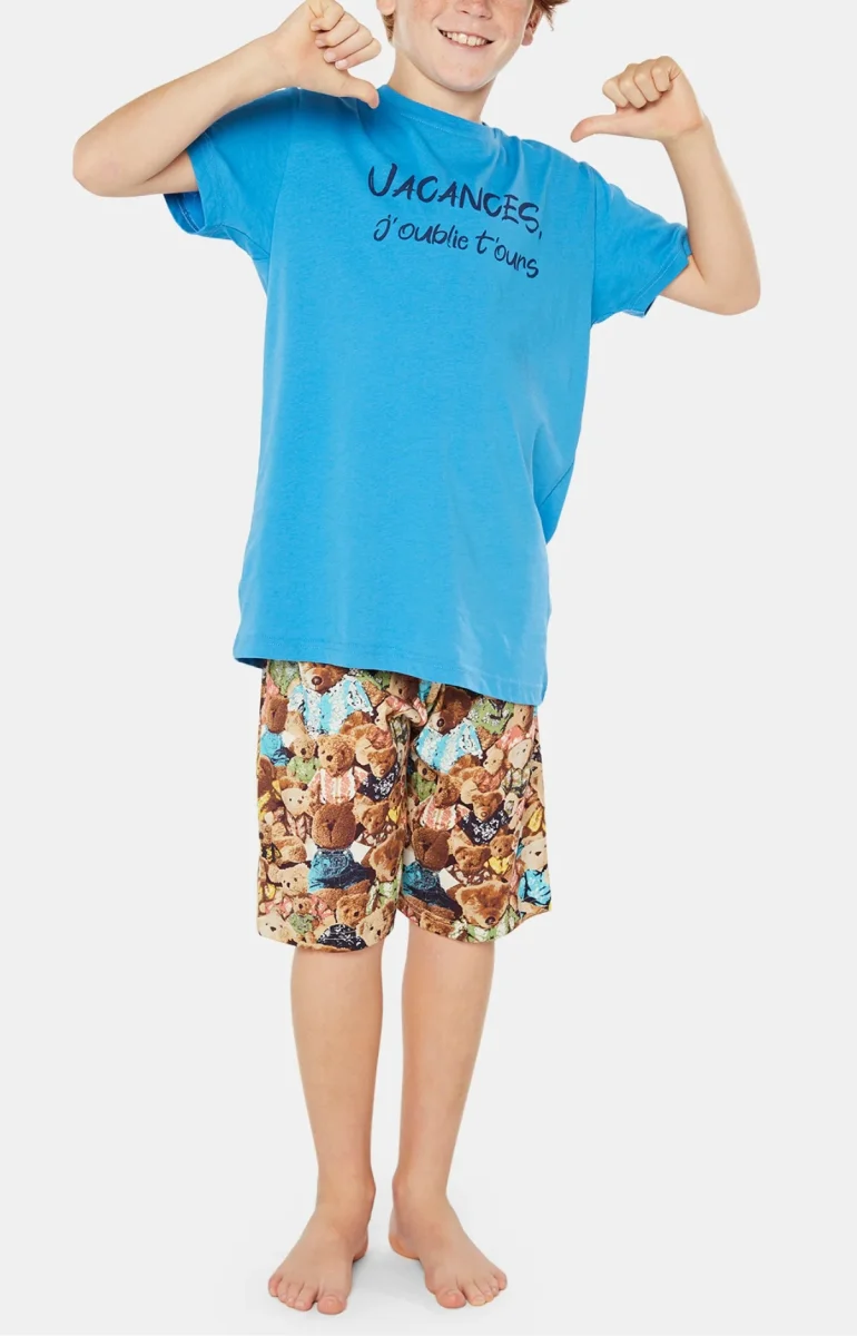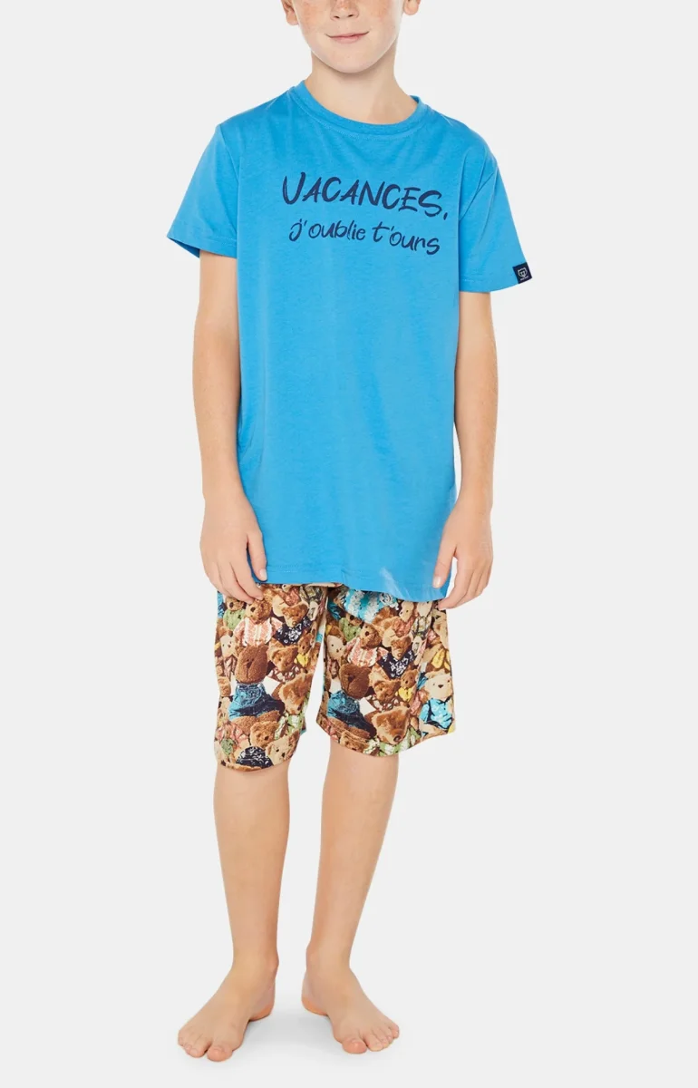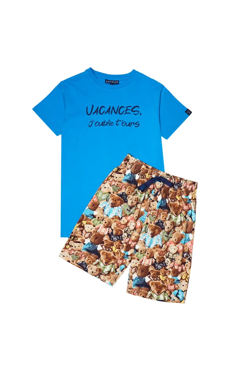 Votre enfant ne quitte jamais ses ours en peluche ? Arthur réinvente le mythique Teddy en l’habillant de chemise hawaïenne sur ce pyjama court enfant. En contraste avec son haut plus sobre et uni, ce modèle 100% coton issu de l’agriculture biologique trouvera une place de choix, on n’en doute pas, dans la garde-robe nocturne de votre enfant. Les paris sont pris !