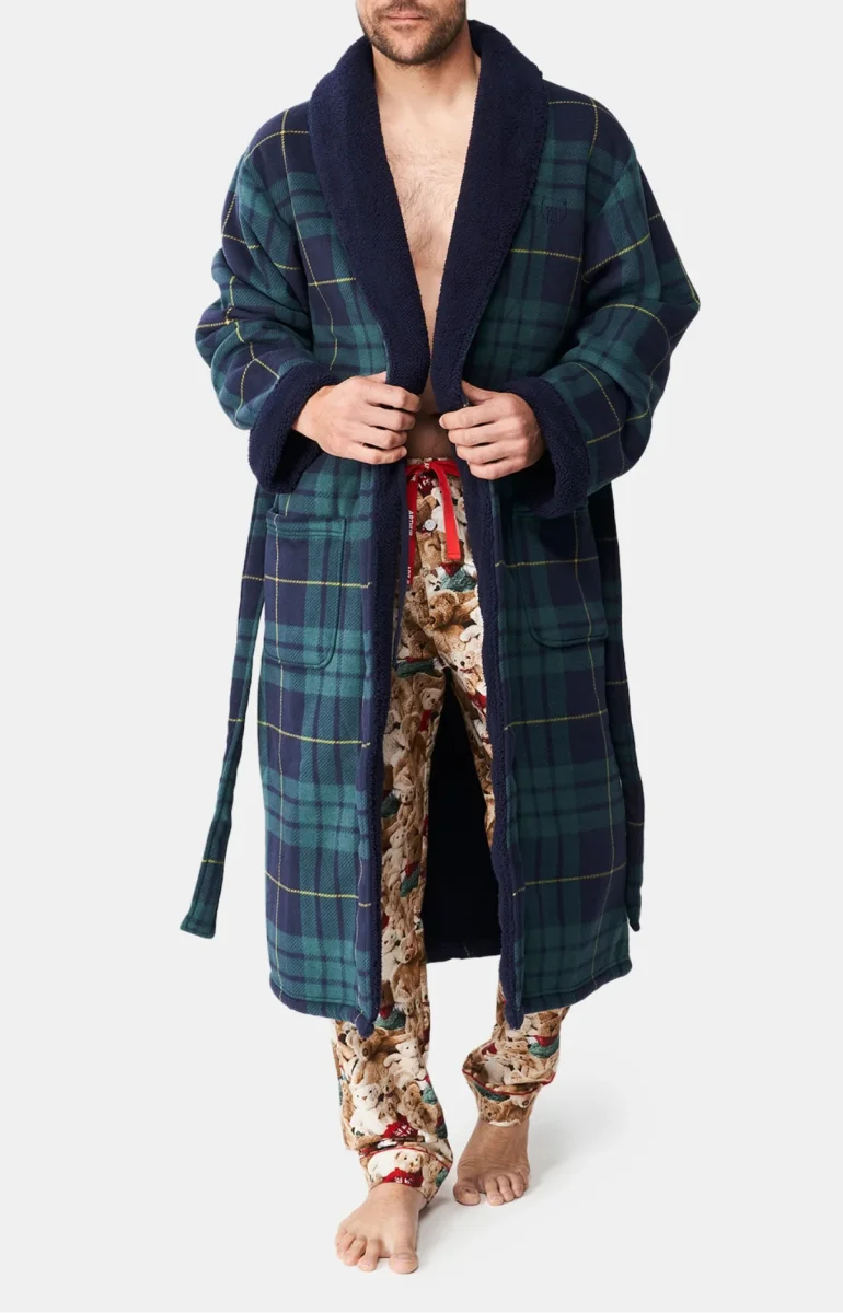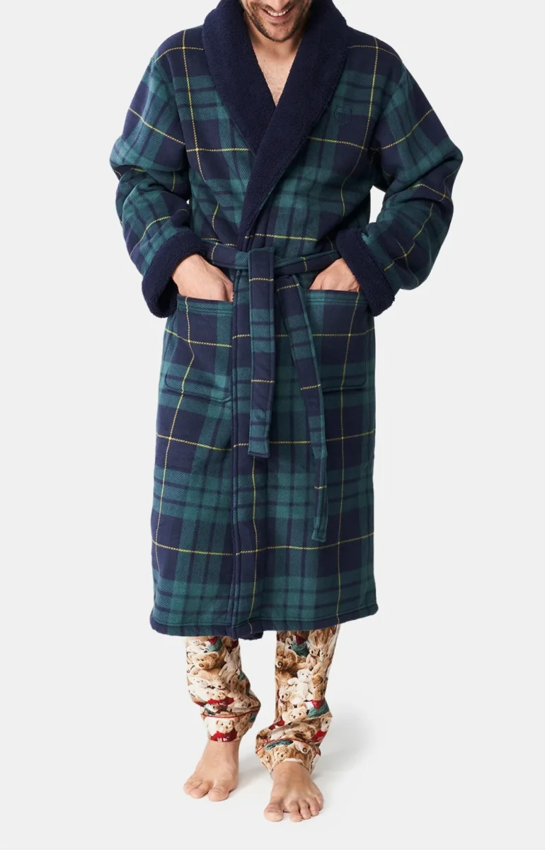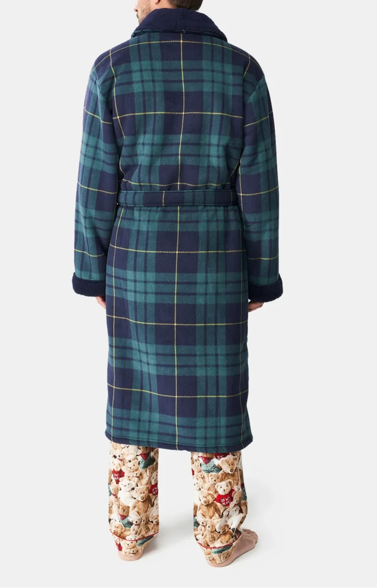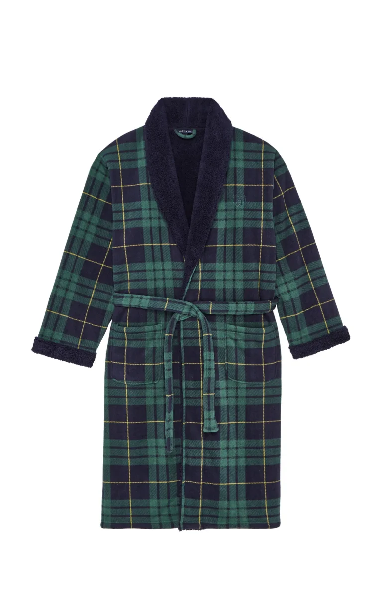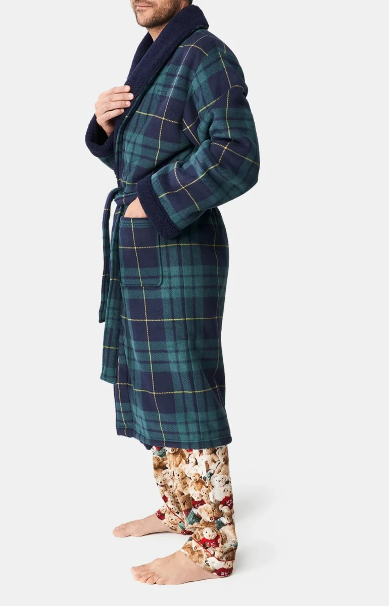– Robe de chambre Homme – Micro polaire imprimée 100% polyester, doublure unie sherpa – Forme ceinturée avec 2 poches plaquées – Col châle – Longueur environ 120 cm