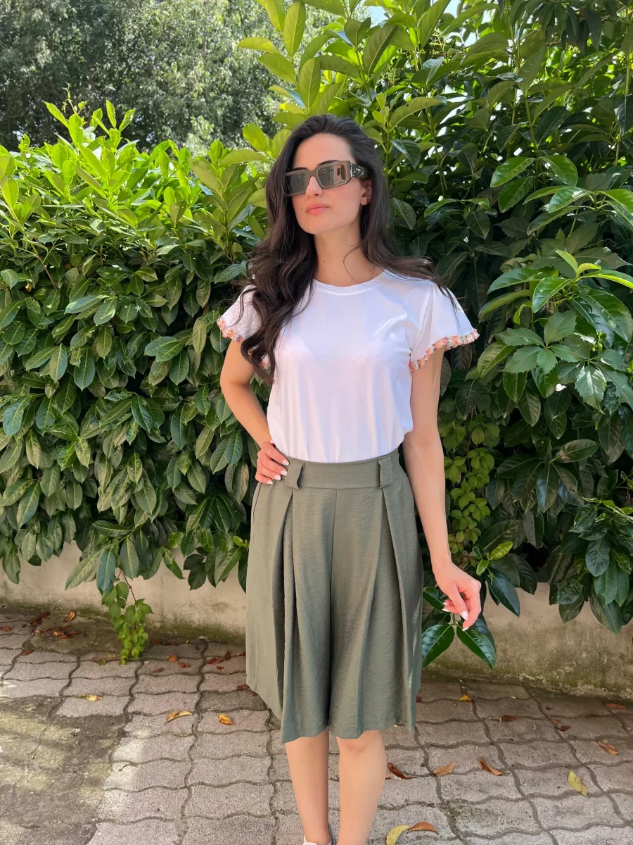 Scopri la leggerezza e l’eleganza di questa t-shirt caratterizzata dalle maniche farfalla, ampie e fluide che donano movimento e un tocco romantico al tuo look quotidiano. Perfetta per chi ama capi versatili, confortevoli ma con uno stile raffinato.