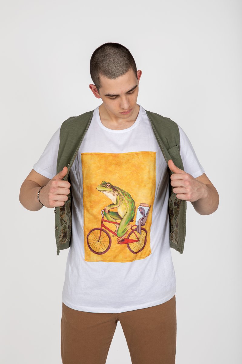 t-shirt con rana in bicicletta