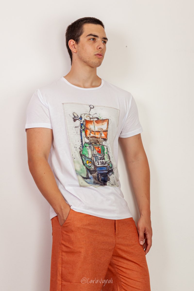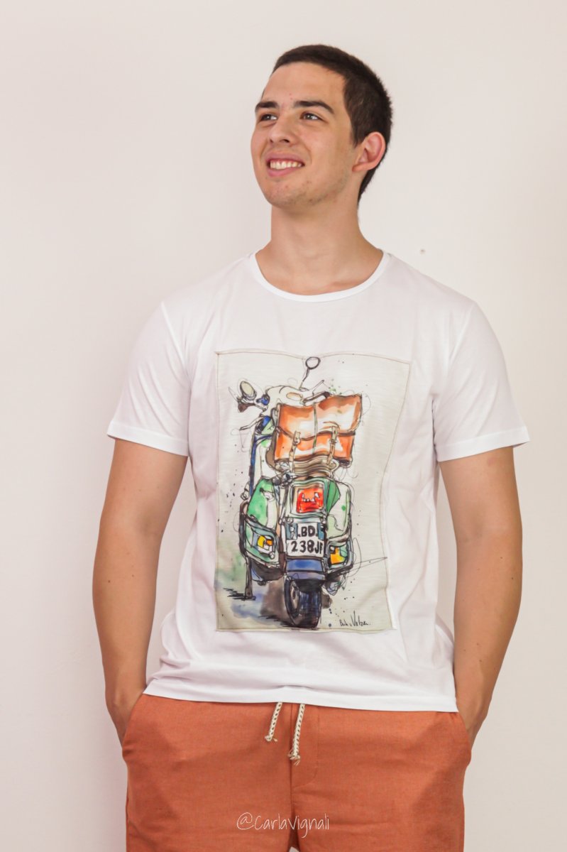 Aggiungi un tocco di stile retrò al tuo guardaroba con la nostra T-shirt Uomo con Vespa. Realizzata in cotone morbido e traspirante, questa t-shirt offre un comfort eccezionale e una vestibilità perfetta. La stampa accattivante della Vespa, simbolo di eleganza e libertà, evoca l’atmosfera delle strade italiane e lo spirito del viaggio. Perfetta da abbinare a jeans, pantaloni casual o shorts, è l’ideale per ogni occasione informale. Esprimi il tuo amore per il design classico e la cultura italiana con la nostra T-shirt Uomo con Vespa, un must-have per ogni appassionato di moda e motori.