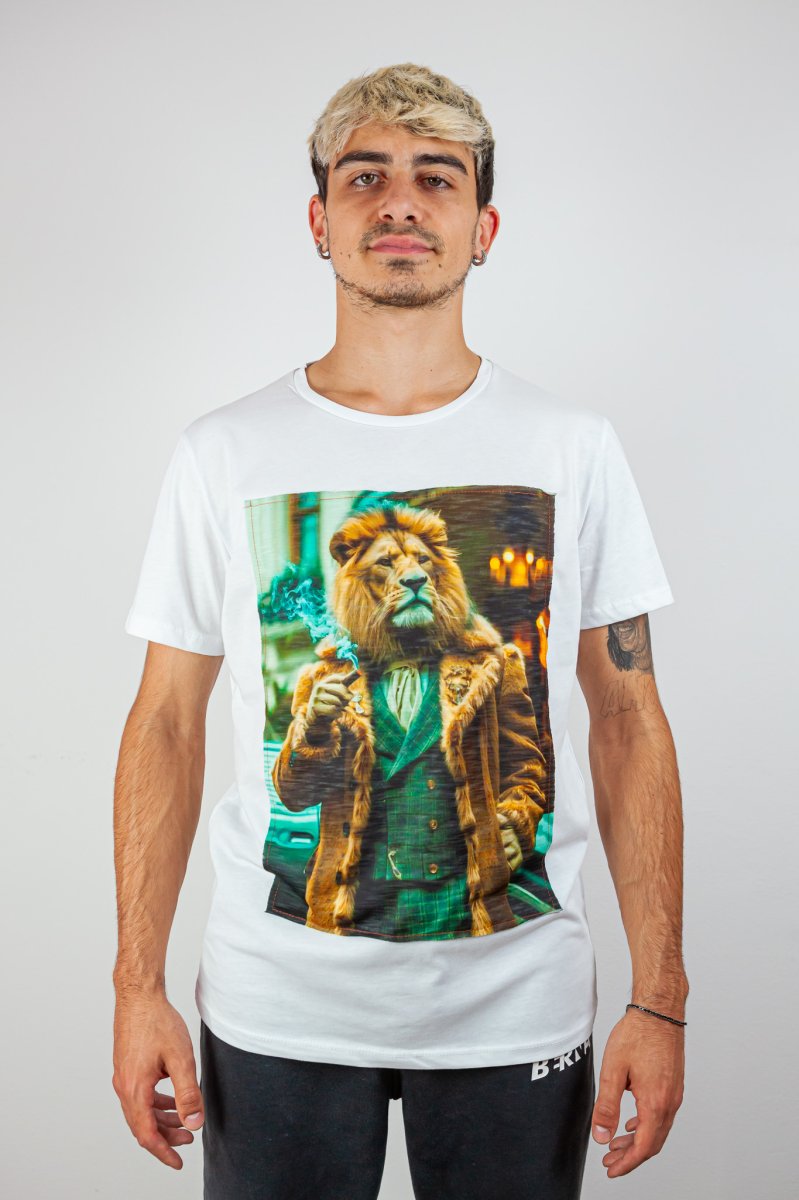 Aggiungi un tocco di originalità al tuo guardaroba con questa esclusiva T-shirt da uomo in cotone, caratterizzata da una vivace stampa patch che ritrae  il leone in doppio petto, elegantemente abbellito da una pelliccia e intento a fumare il sigaro. Questo design audace e accattivante cattura l’attenzione e rappresenta un perfetto mix di stile e personalità.