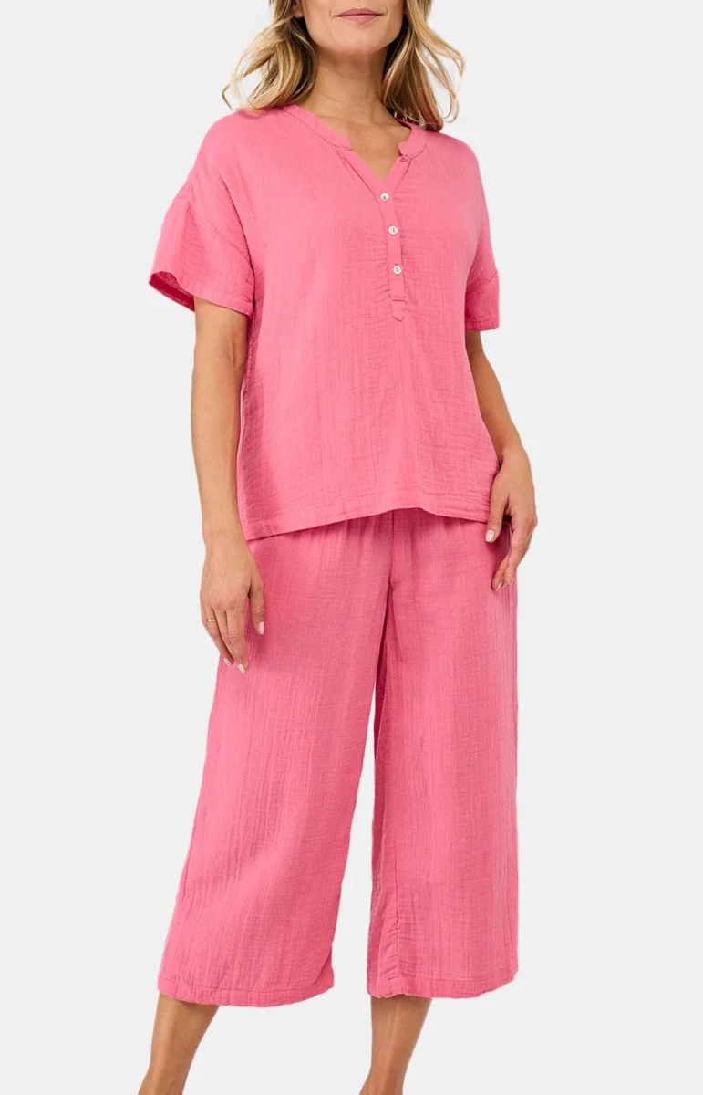– Ensemble de Pyjama Femme ou tenue d’été – à porter de jour comme de nuit, à la plage comme à la maison – 100% gaze de coton issu de l’agriculture biologique – Tee-shirt manches courtes, col tunisien 3 boutons – Pantalon mi-long évasé, longueur 7/8, ceinture élastiquée et cordon de serrage – Motif exclusif […]